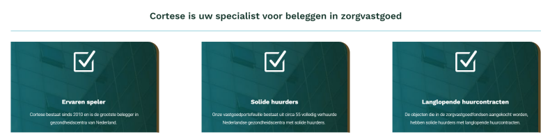 Cortese richt zich volledig op zorgvastgoed. Hoewel deze sector stabiel is, brengt een sterke focus risico met zich mee. Wil je meer diversificatie? Dan moet je aanvullende investeringen overwegen. Denk hierbij aan bijvoorbeeld andere vastgoedfondsen of vastgoedaandelen.